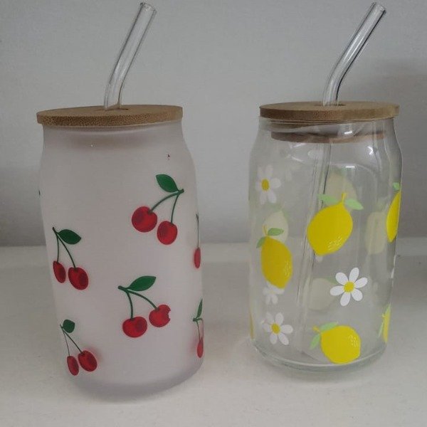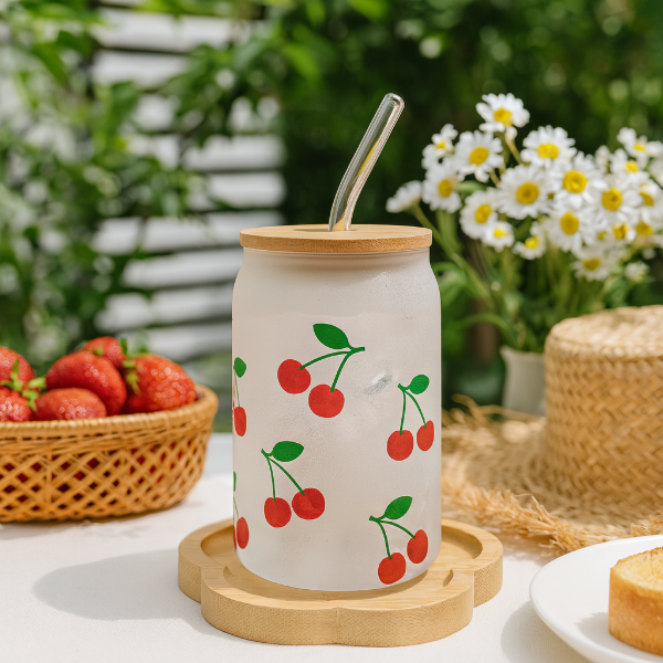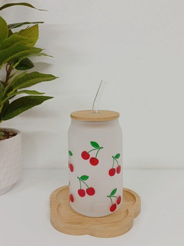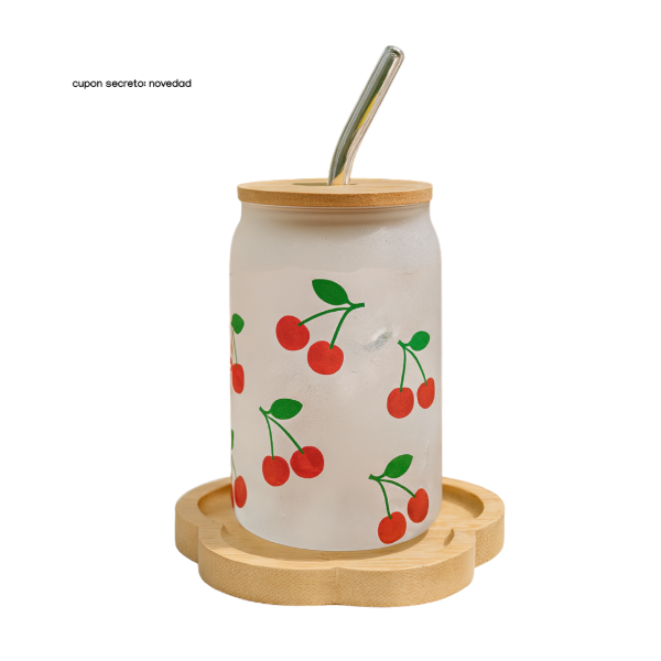 Hecho de vidrio grueso y resistente, con diseño estampado de cerezas y tapa de bamboo con sorbete reutilizable.