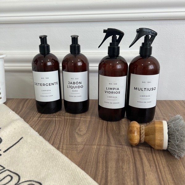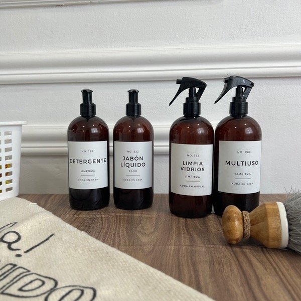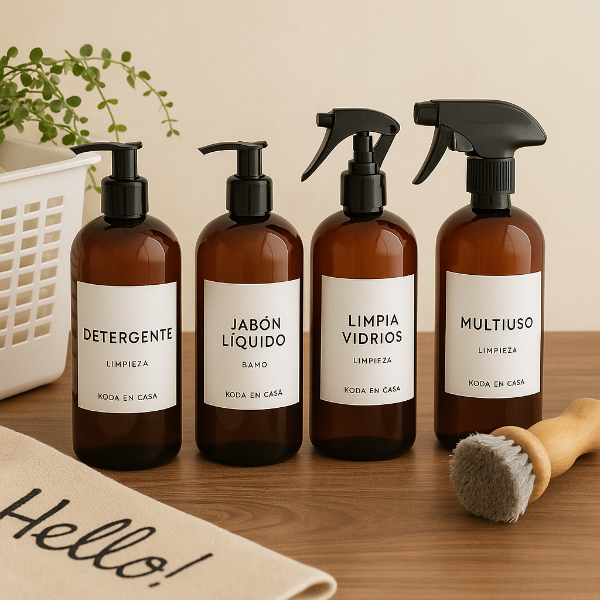👉 Fabricados en plástico PET ámbar resistente, con etiquetas minimalistas diseñadas en Koda para que tu cocina, baño o lavadero respiren paz visual.